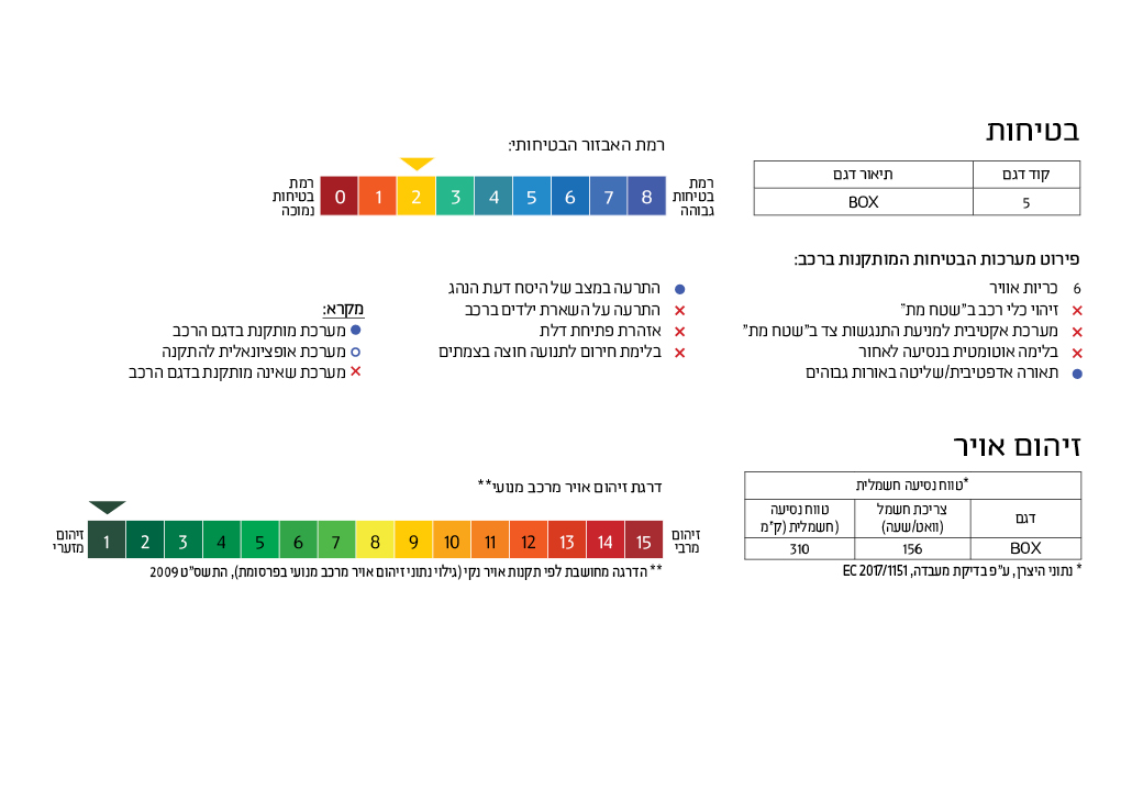 ** טווח נסיעה וצריכת חשמל – על פי נתוני היצרן בבדיקות שנערכו בהתאם לנדרש ע״פ דין. הנתונים המוצגים אינם מתייחסים לנתוני רכב ספציפי אלא נועדו לאפשר ללקוח השוואה בין דגמי רכב שונים. אבזור ואפיון הרכב עשויים לשנות את תכונות וביצועי הרכב כגון: משקל, אווירודינמיקה, צריכת חשמל, פליטת מזהמים וכו׳. טווח הנסיעה וצריכת החשמל בפועל מושפעים מגורמים שונים, כגון, אך לא רק: הרגלי נהיגה וטעינה, מזג אוויר, תנאי הדרך, גיל הסוללה ותחזוקת הרכב ולכן עשויים להצטמצם בפער משמעותי ביחס לנתוני המעבדה האמורים. קיבולת הסוללה ברכב חשמלי מצטמצמת לאורך הזמן ובהתאם לאופן השימוש. לפרטים נוספים ראו ספר הרכב ואתר היצרן.
